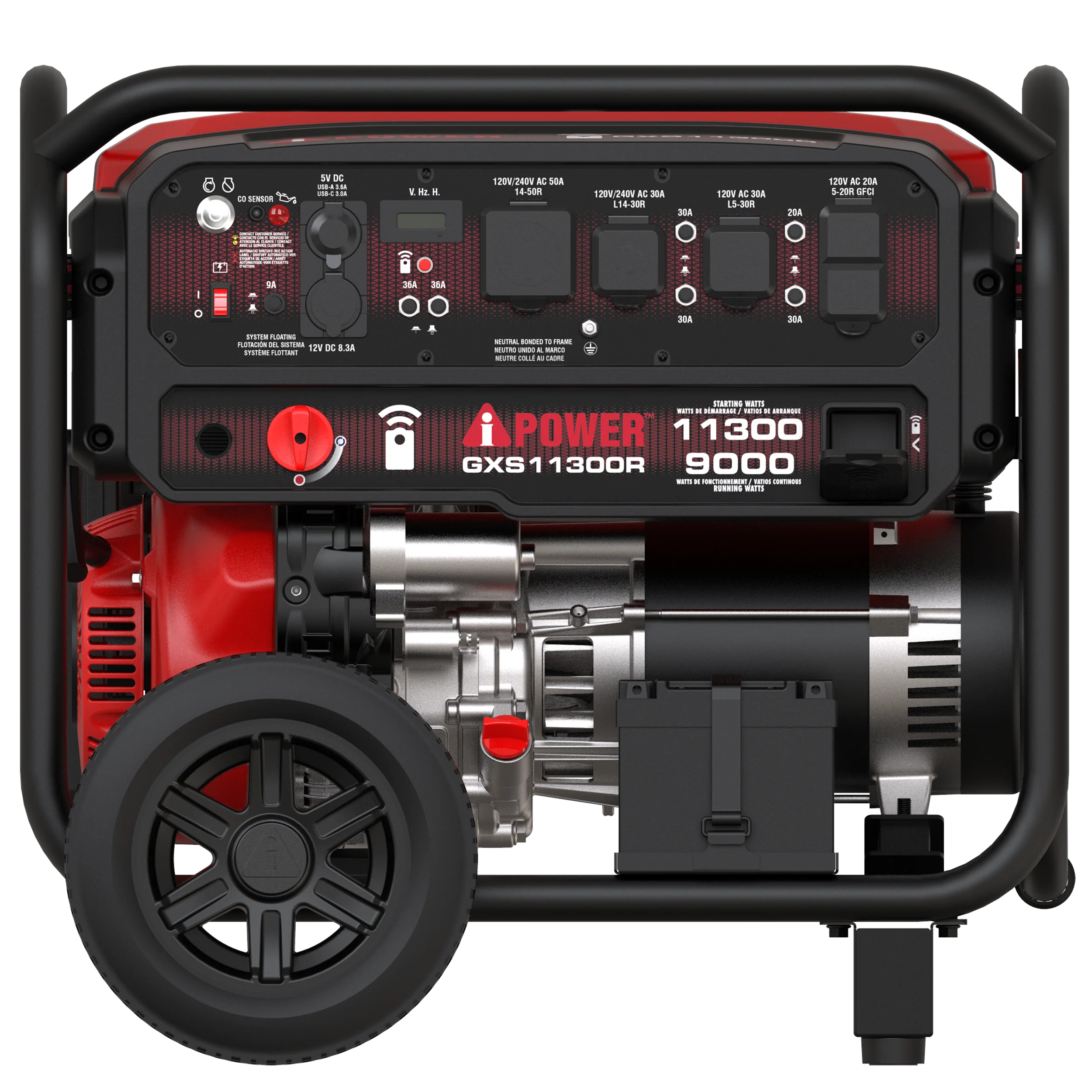 Featuring a 459cc OHV engine with cast iron sleeve and low oil shutdown, the GXS11300R Remote Control Portable Generator has 11,300 starting watts and 9,000 running watts on gasoline. The 9.5-gallon fuel tank provides an extended run time of up to 18 hours at 25% load. It offers simple starting through recoil, electric, and remote start, plus a battery and fob is included.