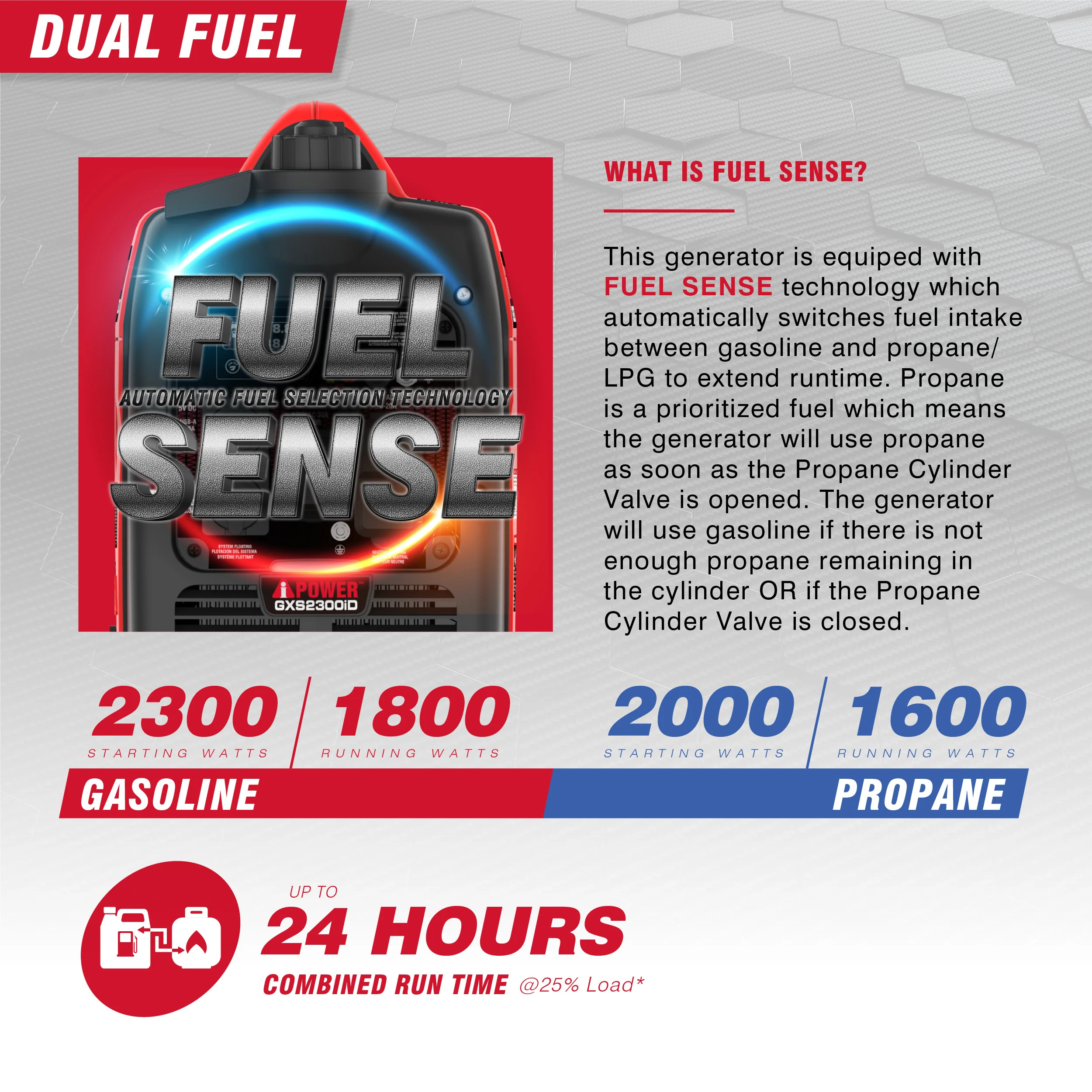 With a completely new design for superior weight reduction and a CO Sensor with auto shutdown, the A-iPower GXS2300iD Dual Fuel Inverter is powered by an 80cc OHV high performance 4 cycle engine. With 2,300 starting watts and 1,800 running watts on gasoline and 2,000 starting watts and 1,600 running watts on propane, it offers <3% THD of clean power output, keeping sensitive electronics safe.Ā